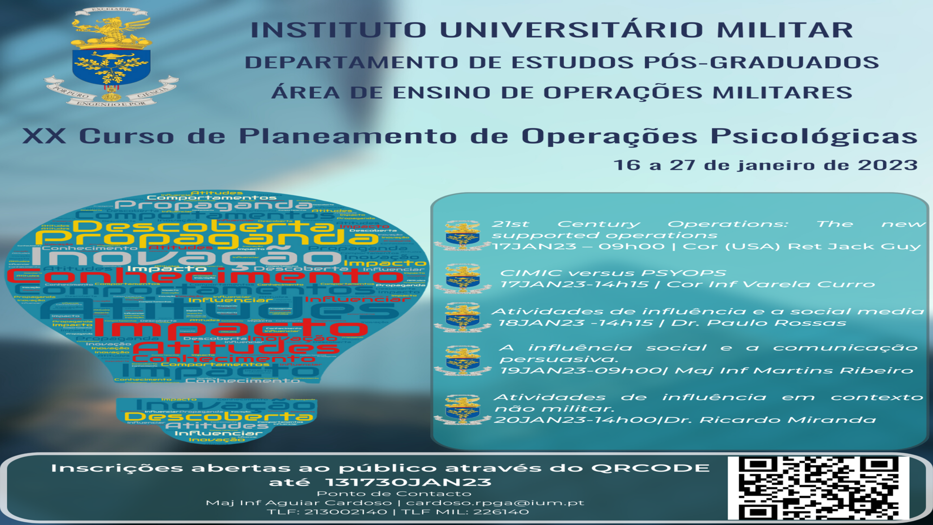 Teve lugar no Instituto Universitário Militar, no dia 27 de janeiro de 2023, a cerimónia de encerramento do 20º Curso de Planeamento de Operações Psicológicas (20º CPOP), presidida por SEXA o Contra-Almirante Salvado Figueiredo, Chefe dos Estudos Pós-Graduados.