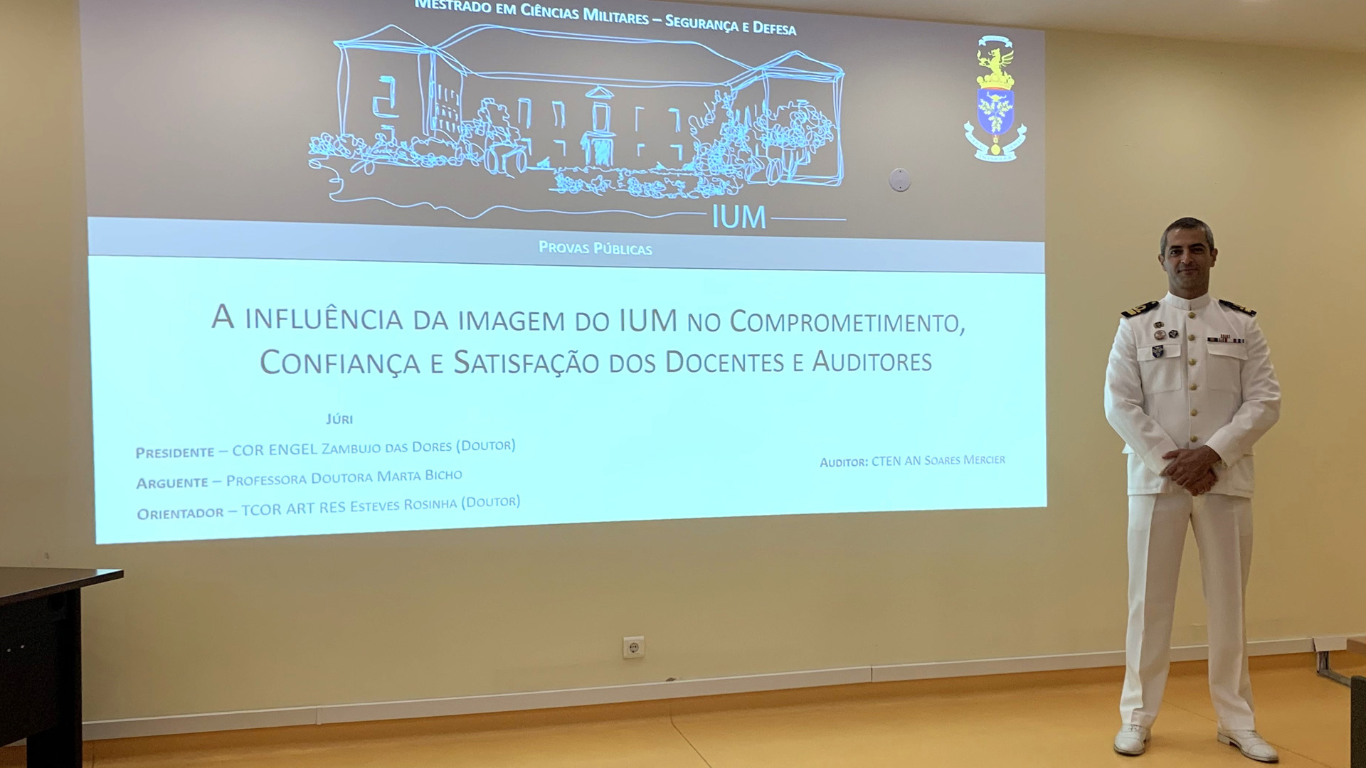 A prova consistiu na discussão pública da dissertação intitulada “A influência da imagem do Instituto Universitário Militar no comprometimento, confiança e satisfação dos docentes e auditores” do candidato Capitão-Tenente Bruno Alexandre Soares Mercier, da Marinha.