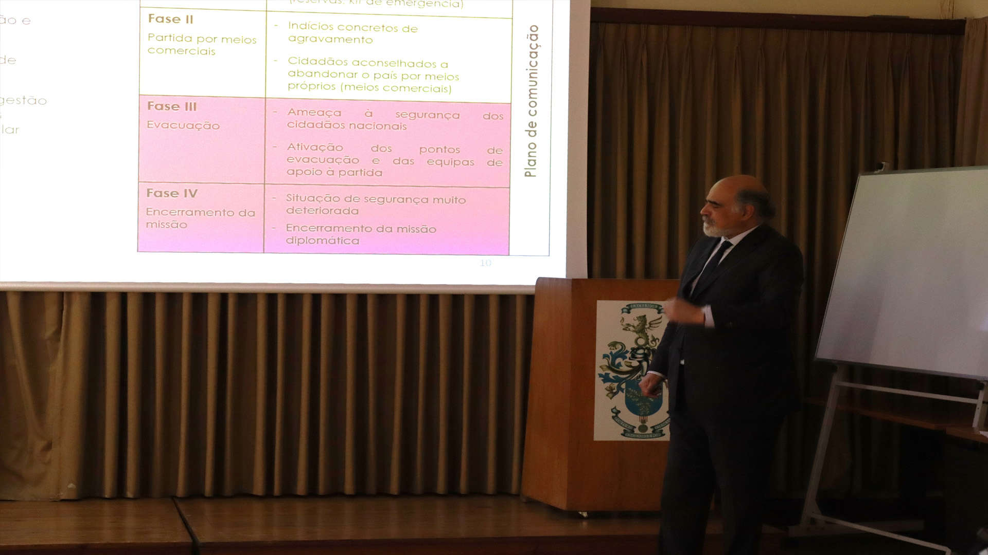 Durante a palestra foi abordada a importância das Forças Armadas na antecipação ou execução de uma evacuação de cidadãos nacionais, da União Europeia e da Comunidade dos Países de Língua Portuguesa. A comunicação permanente, entre o Sr. Embaixador e o Comando Conjunto para as Operações Militares e o apoio no planeamento de contingência têm permitido realizar o apoio necessário de forma célere, garantindo aos cidadãos o apoio nacional em situações de crise, acidente grave ou catástrofe.